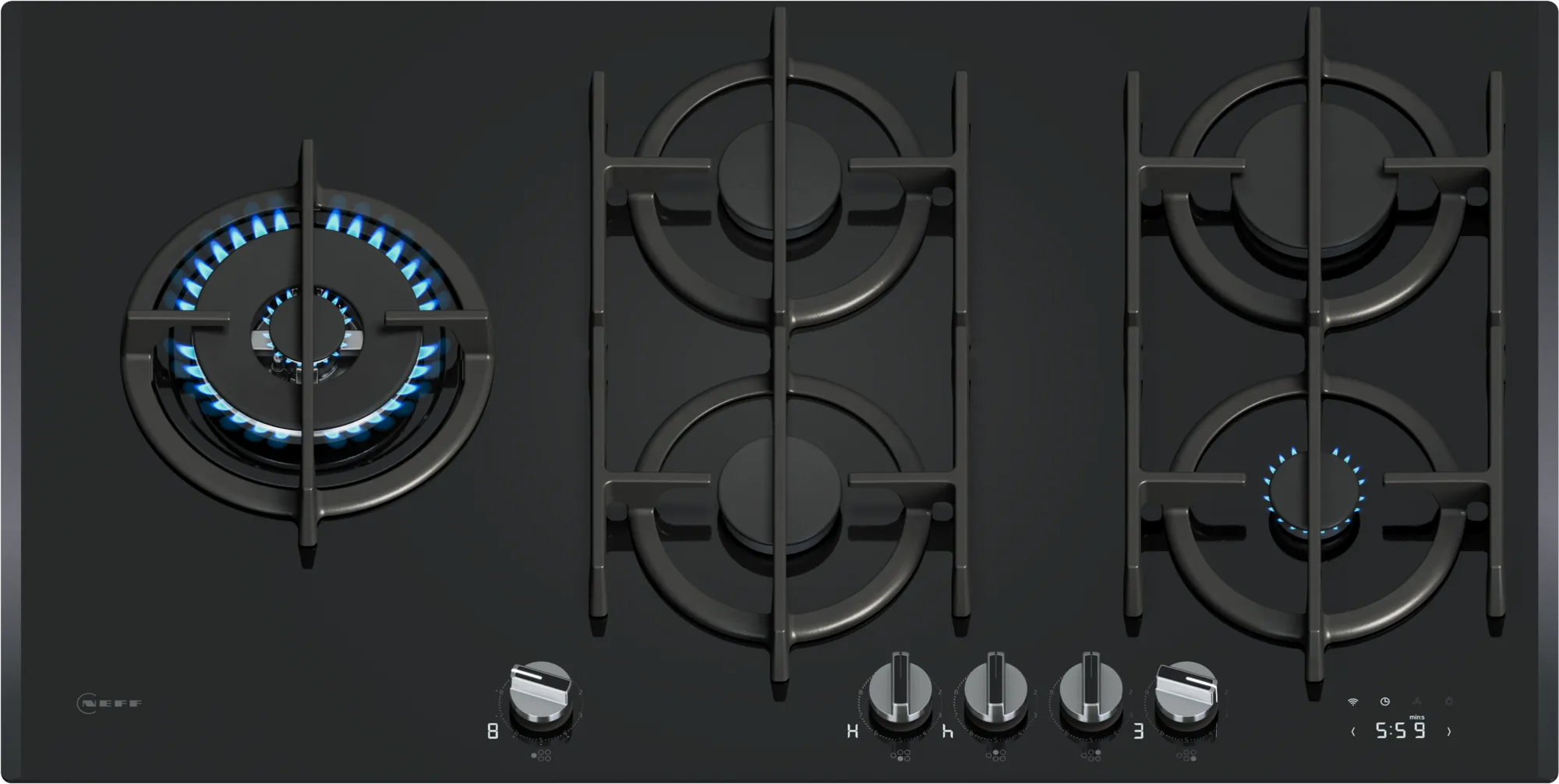 NEFF 60cm Black Tempered Glass, 4 burner, Cast Iron supports, FlameSelect, LED display - Flush or Surface